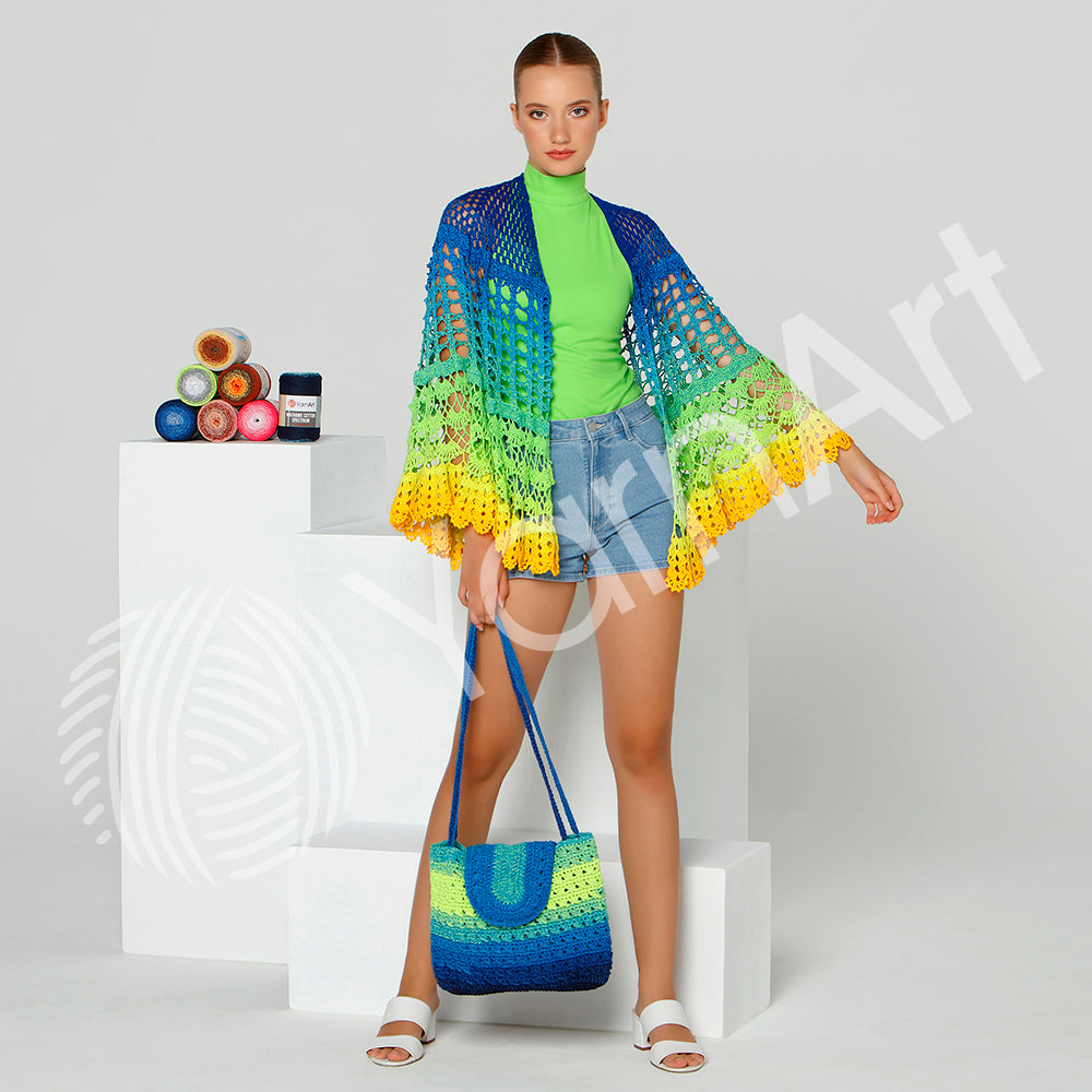 הרכב כותנה וצבעים קיציים מתאים במיוחד לסריגת מוצרים לקיץ כמו שאלים, שמיכות, שמלות, חולצות, קרדיגנים, מוצרי תינוקות ואביזרי בית.
